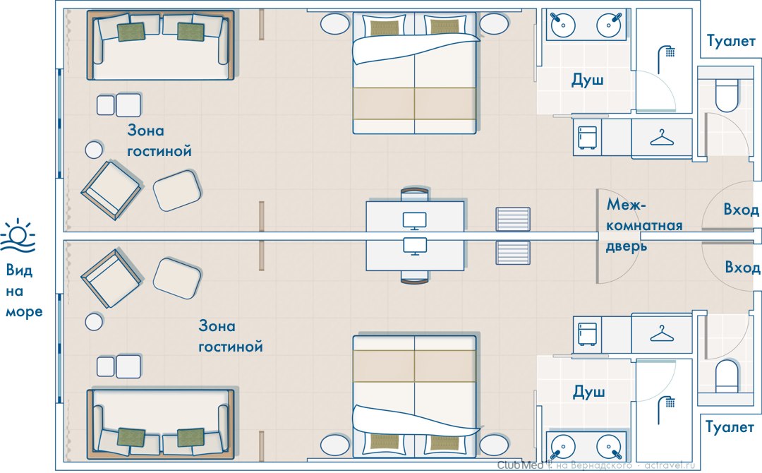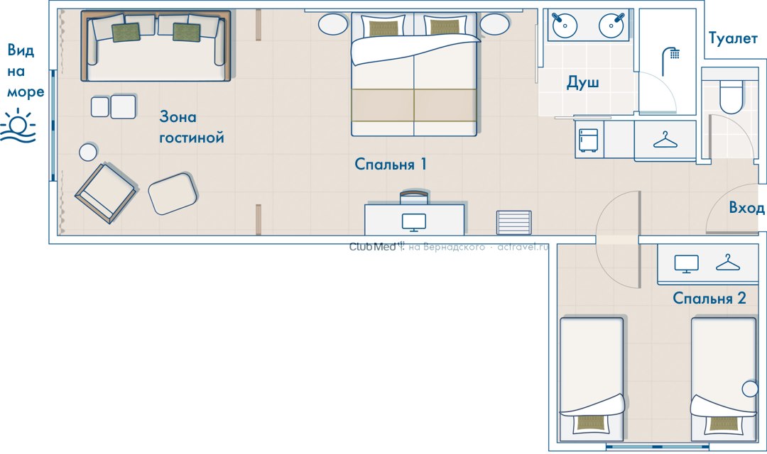 Номера Deluxe Family расположены в центре курорта рядом с пляжем состоят из двух комнат (отдельная детская спальня). Вид на море.
