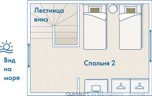 Двухуровневый номер с комнатами друг над другом. Отдельная спальня для детей. Расположен в центре курорта.