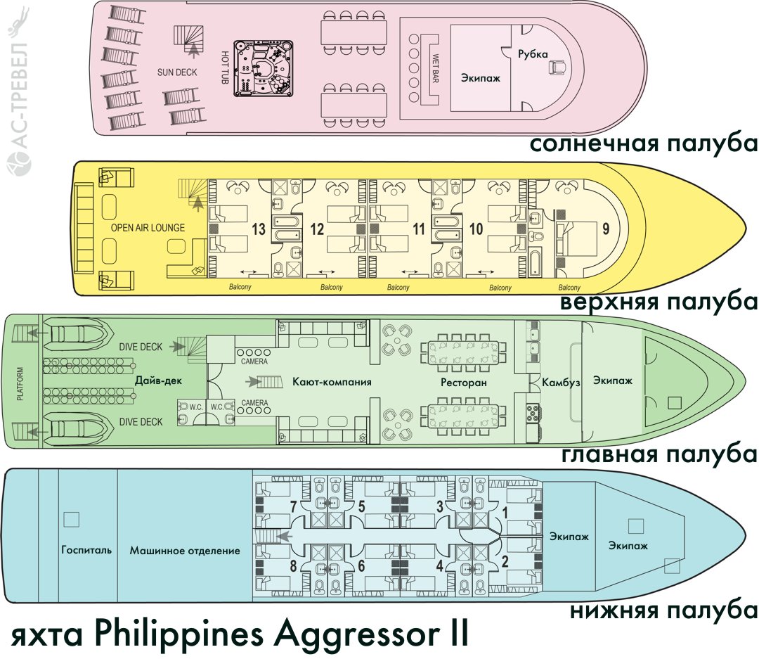 Всего на яхте Philippines Aggressor II 13 двухместных кают.