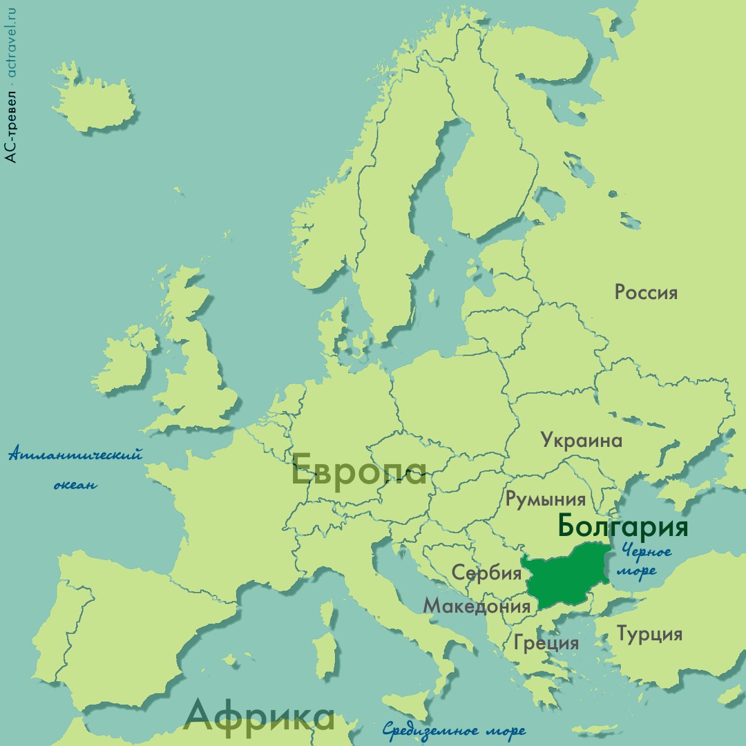 На севере Болгария граничит с Румынией, на западе — с Сербией и Македонией, на юге — с Грецией и Турцией. Восток страны омывает Черное море.