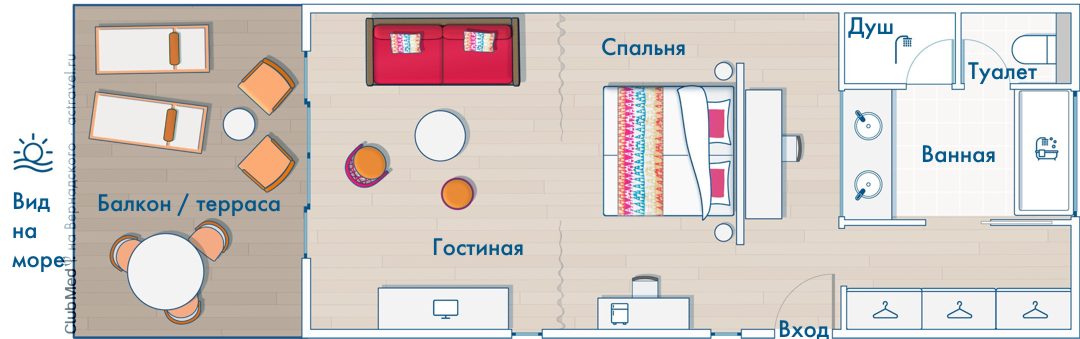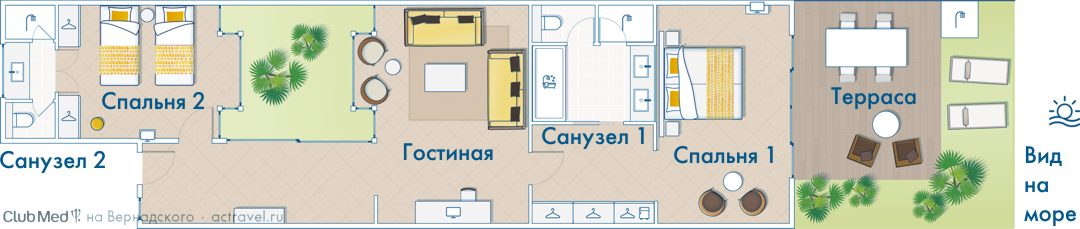 Номер спроектирован так, чтобы у детей и родителей было личное пространство. Комнаты выполнены в ярких тонах, а общая терраса идеально подходит для наблюдения за океаном и вечерних разговоров в кругу семьи.