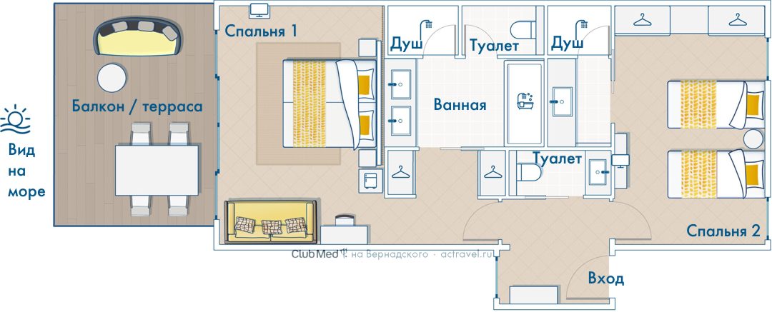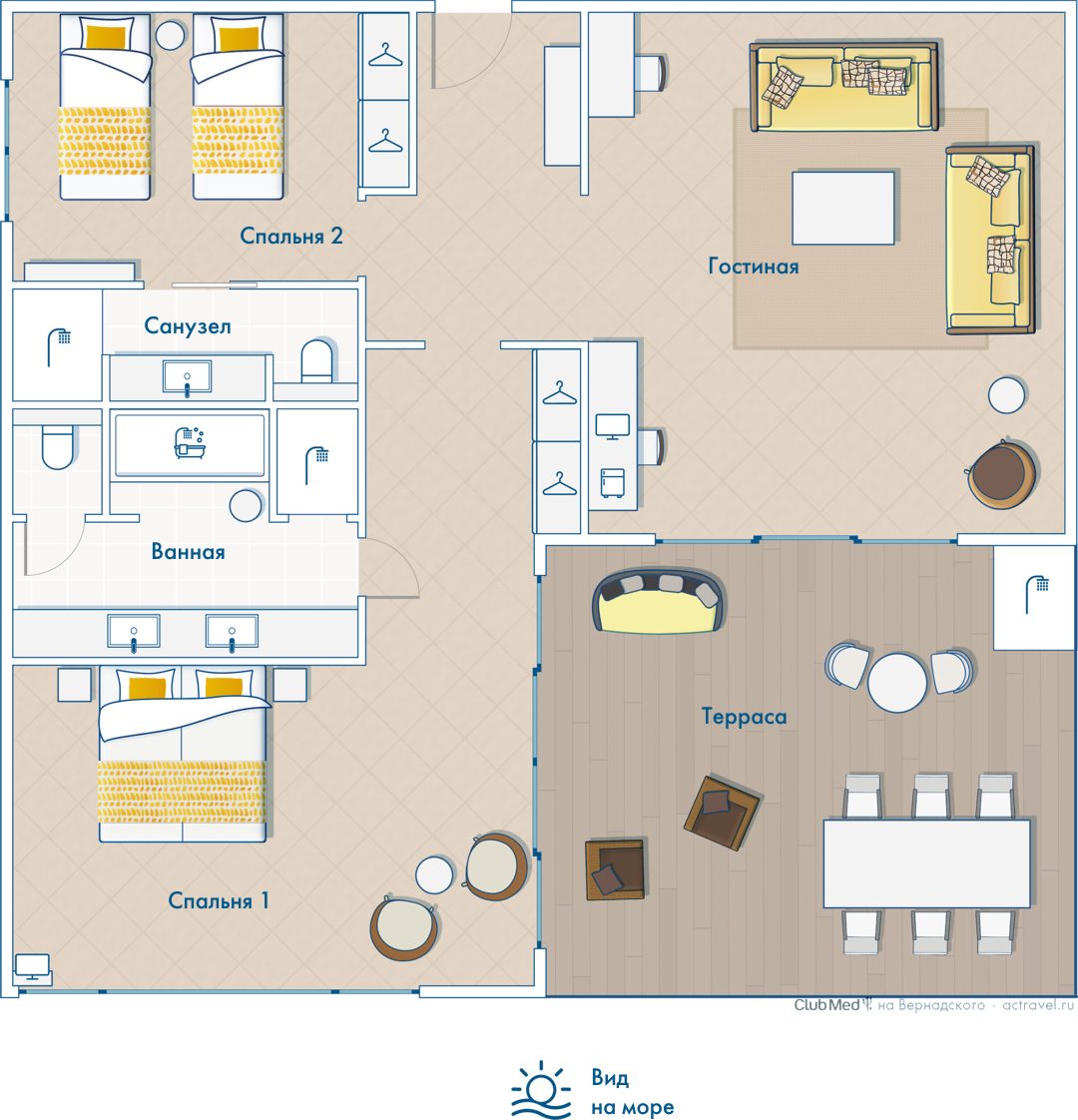 В этом номере с отдельными зонами для детей и родителей есть все условия для премиального семейного отдыха. Стены, декорированные морскими картами, создают атмосферу приключений, а ненавязчивые песочные оттенки добавляют интерьеру сдержанный шик.