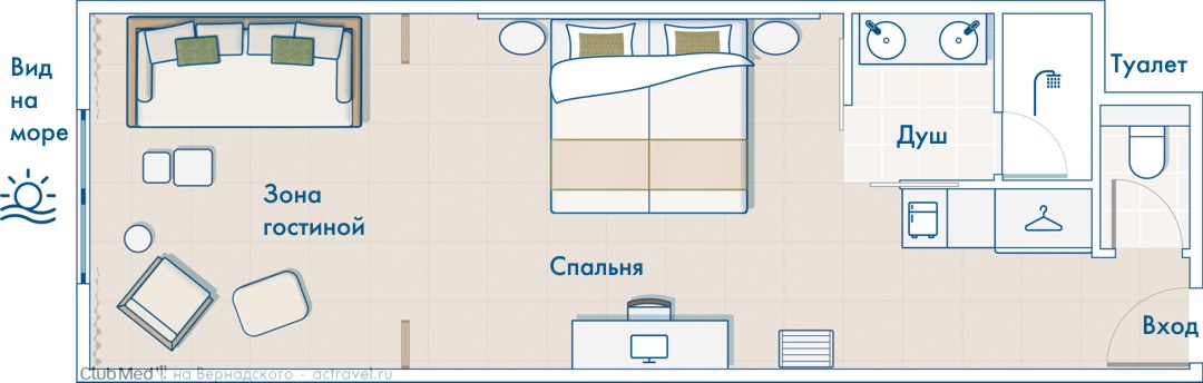 В номере: кондиционер, телевизор, интернет, сейф, мини-бар (без наполнения), душ, фен.