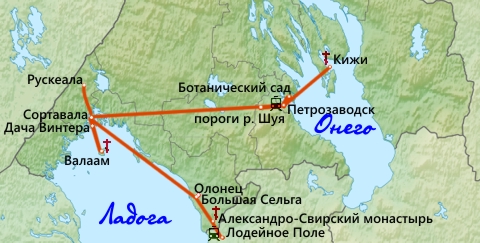 предложил подходящий групповой тур, но сразу предупредил, что направление не пользуется особой популярностью и группа вряд ли наберется. Так и случилось, поэтому был выбран более массовый регулярный тур, охватывающий бассейны двух крупнейших озер Европы: Ладожского и Онежского с проживанием в Петрозаводске и Сортавале. Тур насыщенный, разнообразный, включает небольшую этнографическую часть и проходит через Олонец. То, что надо!