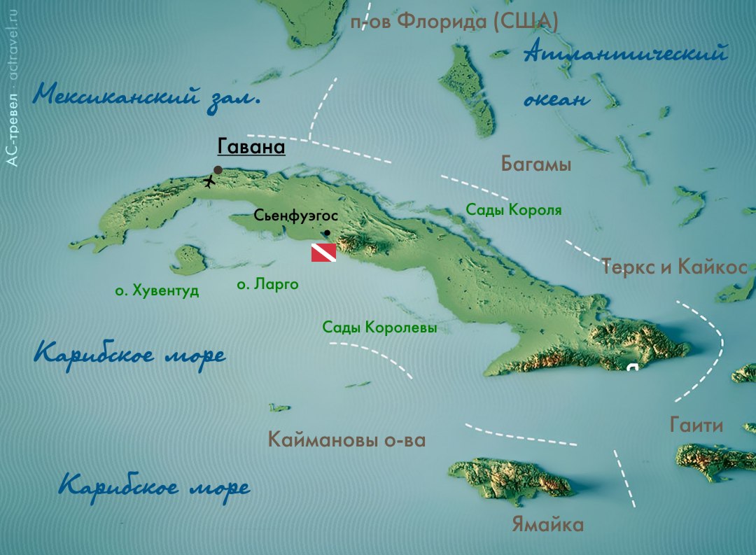 Сьенфуэгос кубинцы называют «Жемчужиной Юга» (La Perla del Sur), благодаря нетронутой красоте своего подводного мира и огромному коралловому рифу, который тянется вдоль побережья. В этой провинции, располагающей сетью комфортабельных отелей для размещения туристов, имеются три центра подводного плавания («Faro de Luna», «Guajimico», «Whale Shark») с огромной акваторией и более 40 точками для погружения. Затопленные корабли, покрытые ракушками и превратившиеся в искусственные рифы, разнообразная фауна с множеством рыб, медуз, черепах, морских ежей и даже, если повезет, китовых акул — все это можно встретить здесь. Тут есть и местная достопримечательность — коралловая 6-метровая колонна «Нотр-Дам», названная так из-за своей похожести на знаменитый парижский собор.