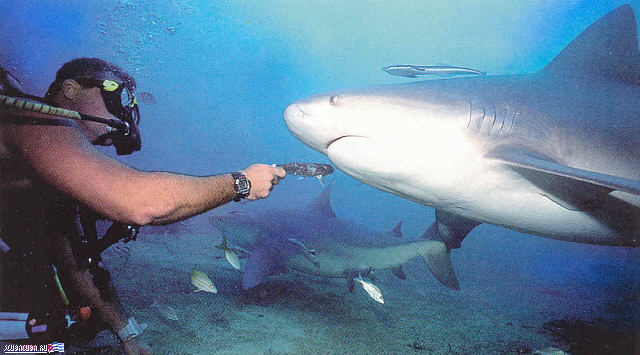 Потом акулы направляются в сторону инструктора. Он как бы приглашает их есть, слегка пошевеливая рыбу, которую он держит в руке. Это занимает не много времени, так как акулы уже знают распределение дайверов.