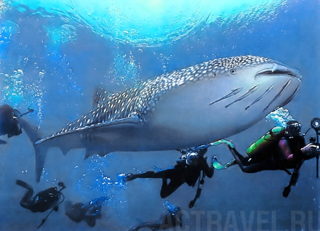 (по-английски whale shark, латинское название Rhincodon typus) — крупнейшая рыба Земли, уже одно это делает погружение с данными животными заветной целью многих дайверов. Акула питается, процеживая воду через жаберные щели, основа ее пищи — планктон