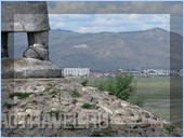 Под ногами железного чабана открывается панорама Кызыла с буддистской мантрой на склоне горы