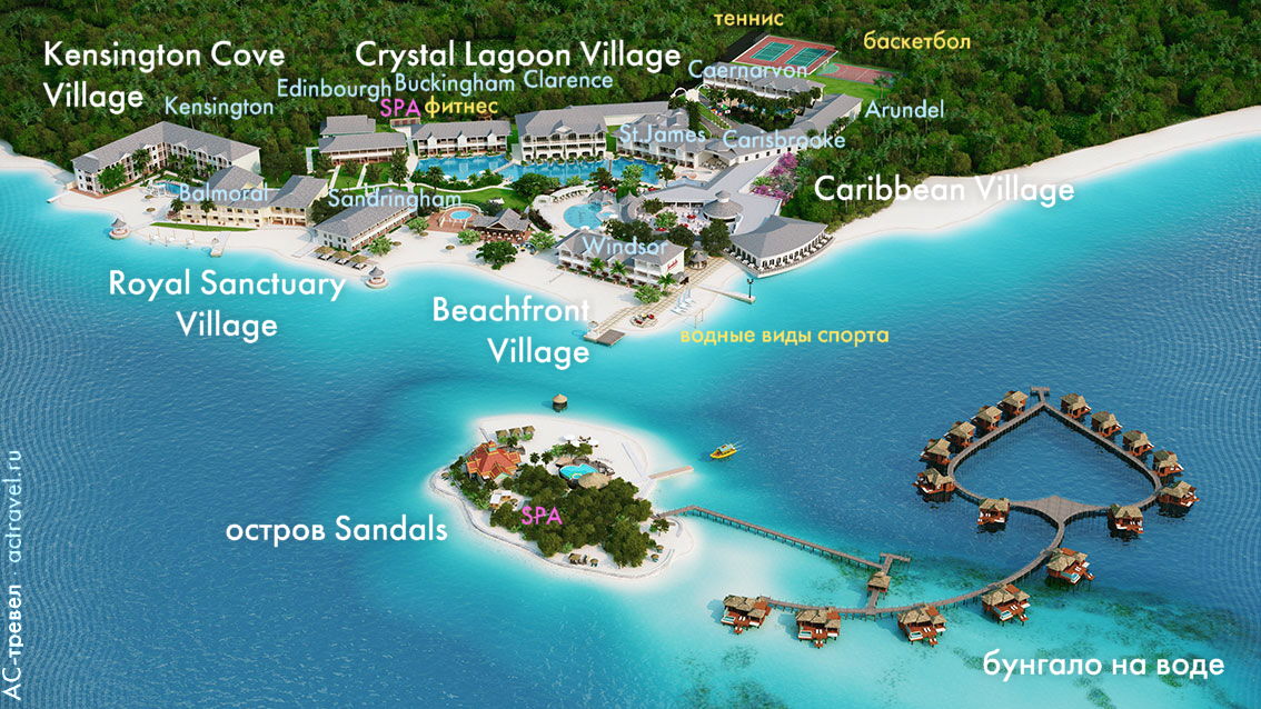 Курорт Sandals Royal Caribbean Resort & Private Island расположен на северном побережье Ямайки, к востоку от города Монтего-Бэй, непосредственно на пляже, напротив частного острова.