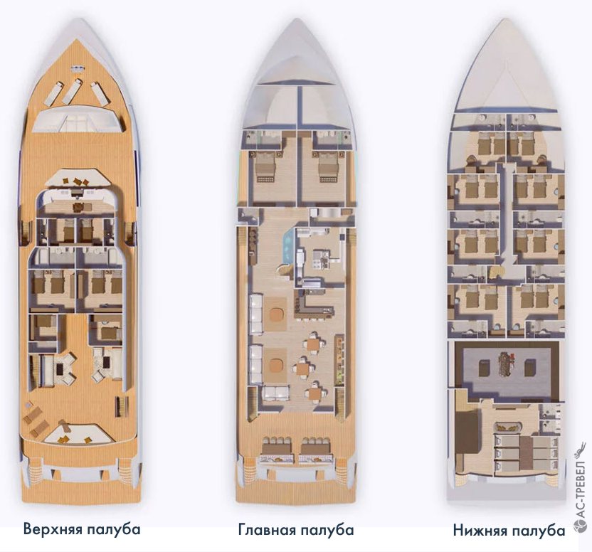 Всего 2 каюты с собственной ванной комнатой на верхней палубе, предлагают комфортное размещение для дайвера-одиночки.