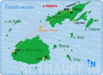 Перелет от международного аэропорта Нади (Nadi International Airport, IATA-код: NAN, ICAO-код: NFFN) до «северной столицы» Лабасы на острове Вануа-Леву занимает около 40 мин. Далее гости совершают увлекательный переезд вдоль кокосовых плантаций и рисовых полей (около часа). Переход по морю до островной пристани — всего около 5 минут.