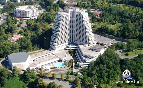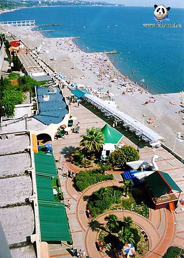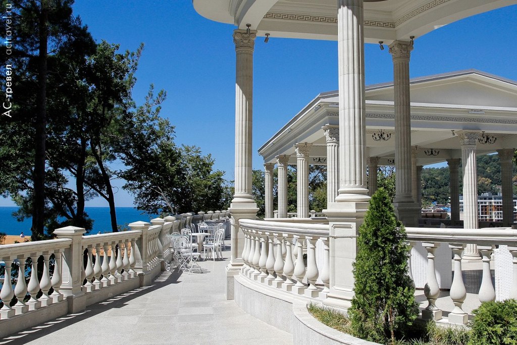 Участок, на котором высятся белоснежные здания, выбран весьма удачно. Вплотную к территории комплекса подступает субтропический парк с богатейшей флорой, выдержанный в ландшафтном стиле, а рядом плещется теплое Черное море!