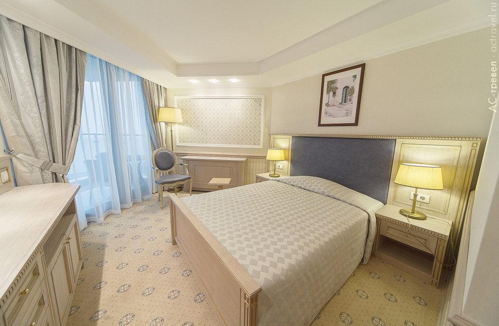 Номер состоит из одной комнаты, санузла, прихожей, балкона. В номере имеются две кровати, стул, кресло, столы: журнальный, туалетный, под TV; прикроватная тумбочка с радиопанелью, цветной телевизор, холодильник, телефон, торшер. Санузел оснащен ванной с душем, умывальником, унитазом, биде. В прихожей — встроенный шкаф.
