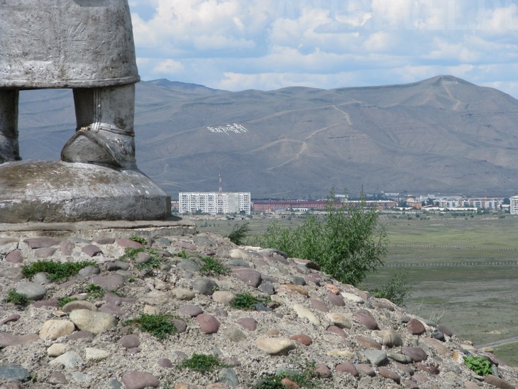 Под ногами железного чабана открывается панорама Кызыла с буддистской мантрой на склоне горы
