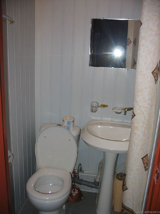 Санузел в номере в гостинице "Причал". Справа за шторкой душ.