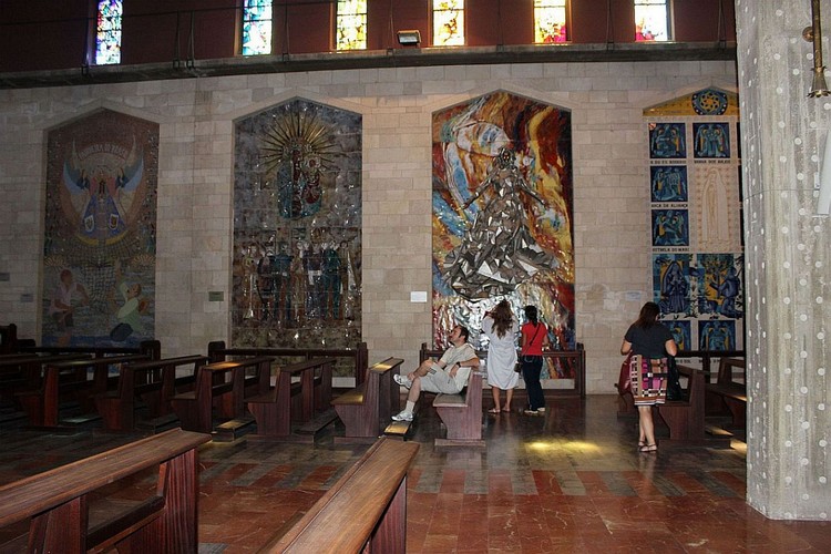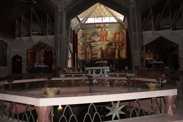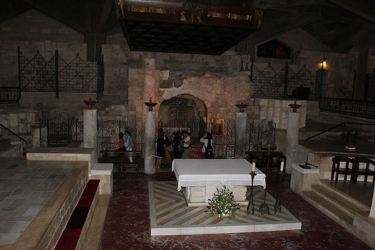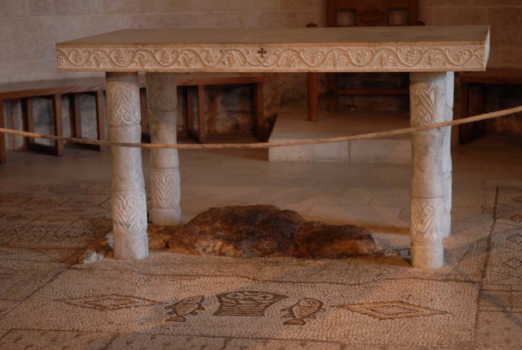 Алтарём церкви служит камень, на котором Иисус Христос раскладывал пять ломтей хлеба и две рыбины, чтобы накормить 5 тысяч человек ↓