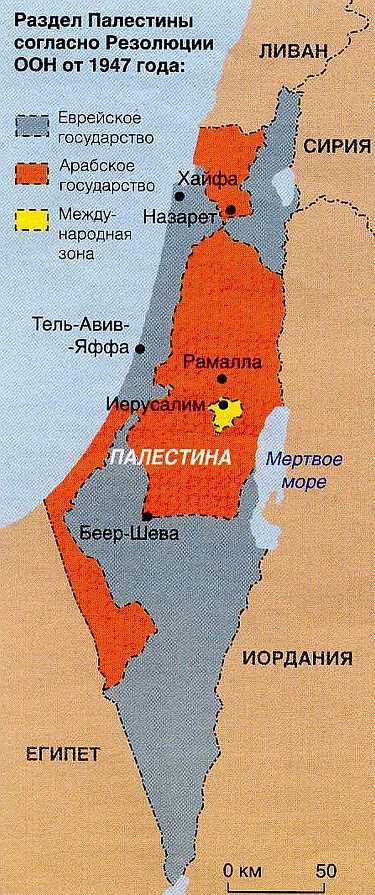 29 ноября 1947 года Организация Объединённых наций (ООН) приняла решение разделить Палестину на два государства: еврейское и арабское. Иерусалим и Вифлеем планировалось оставить международной зоной.