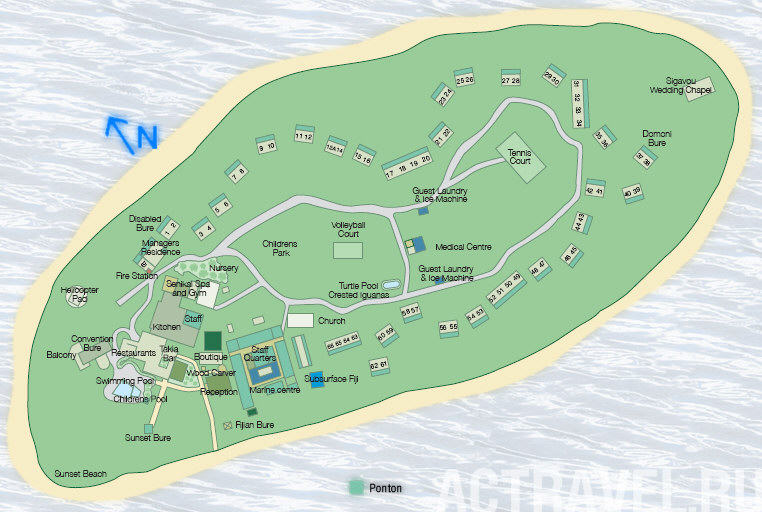 на одноименном острове, расположенном в бухте Нади в 17 км (ок. 30 мин. по морю из порта Денаруа) от города Нади на главном фиджийском острове Вити-Леву.