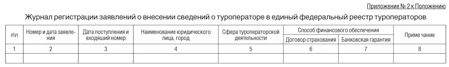 7. Заявление туроператора о внесении сведений о нем в Реестр в прилагаемые к нему документы регистрируются в канцелярии Федерального агентства по туризму, а также в специальном Журнале регистрации заявлений о внесении сведений о туроператоре в единый федеральный реестр туроператоров (приложение N 2 к настоящему Положению).