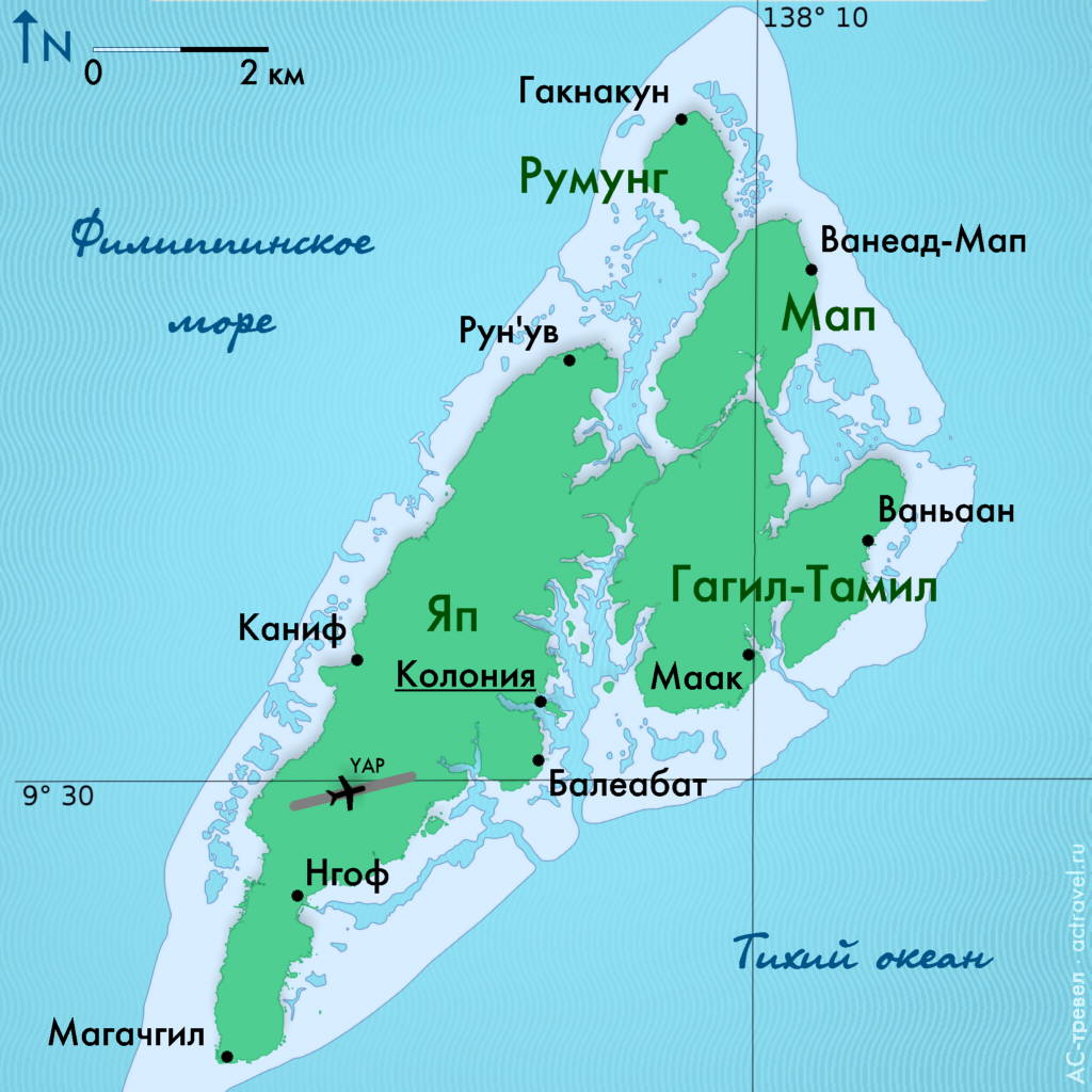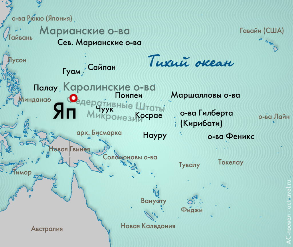 Яп состоит из 134 островов и атоллов (22 из которых обитаемы), принадлежащих к Микронезии, а конкретнее к Западным Каролинским островам Тихого океана. Острова расположены